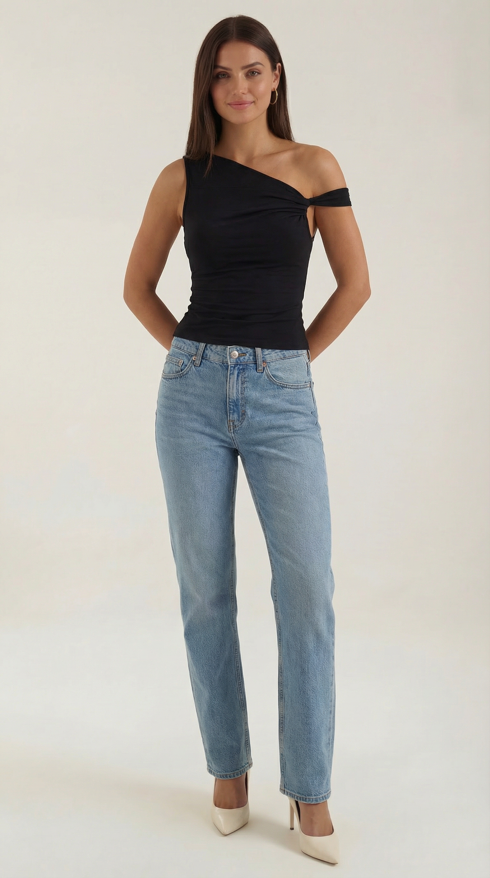 • Asymmetrical one-shoulder neckline to flatter all body types