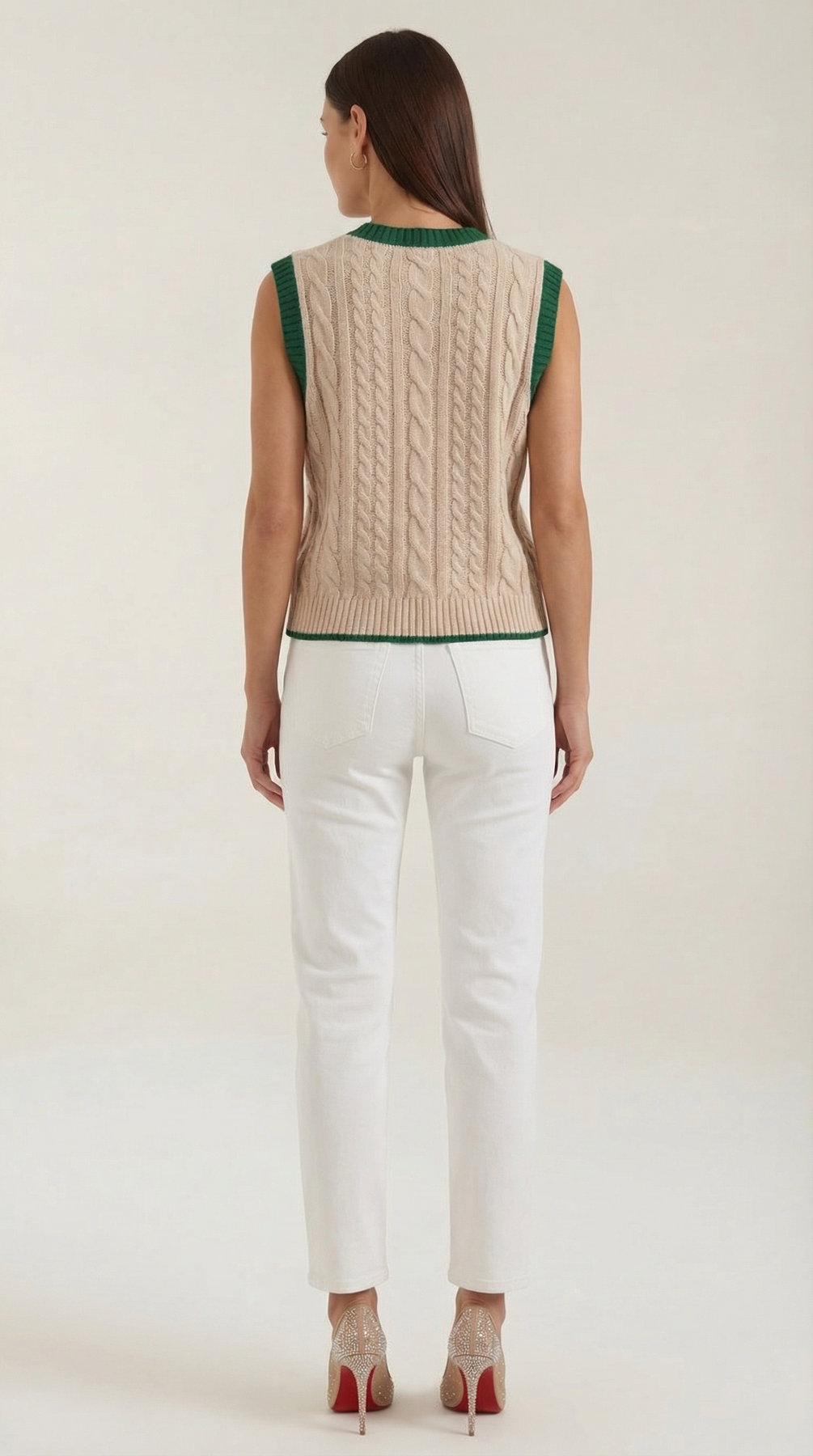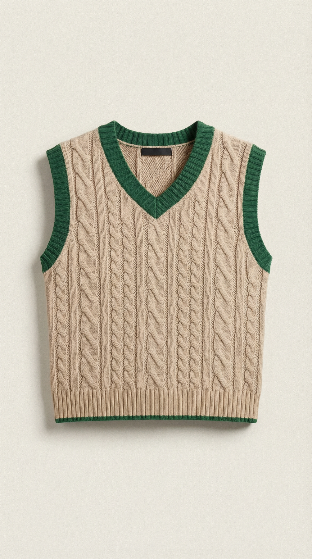 The 'Clara' vest is varsity chic reimagined. This preppy essential features classic cable knit patterns in luxurious material, while contrast trim adds that perfect sporting touch. The fitted silhouette and traditional V-neck create a look that's both nostalgic and now.