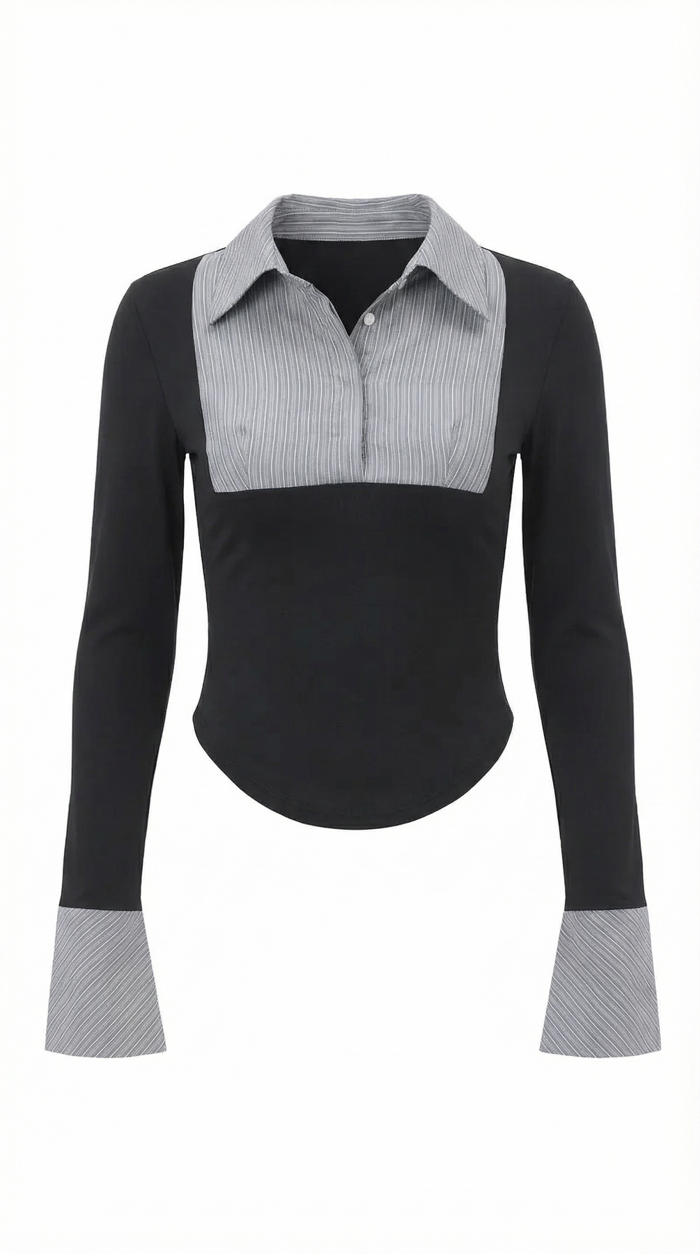 Le haut « Kalliope » incarne la sophistication moderne raffinée. Cette pièce remarquable se distingue par son plastron plissé contrasté et son col impeccable qui attirent tous les regards. Les manches longues ajustées se terminent par des poignets assortis, tandis que la conception sans coutures crée une silhouette élégante qui inspire le sérieux.