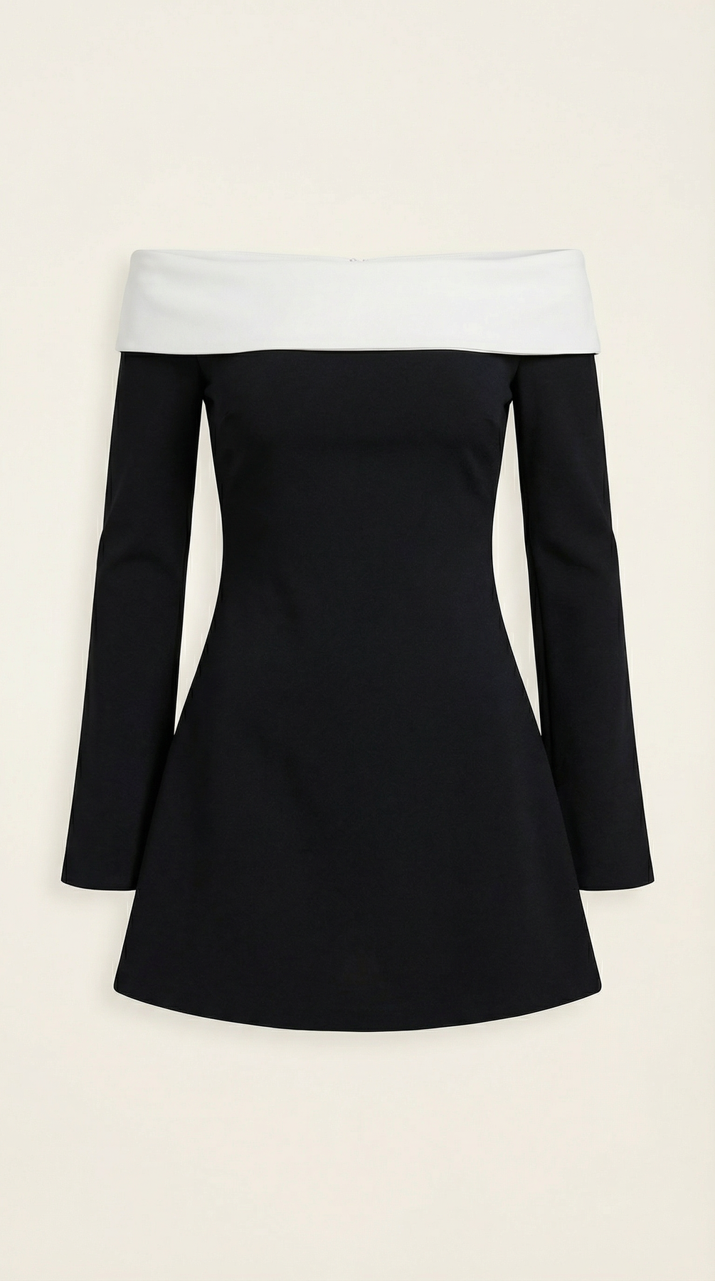 The 'Odessa' dress is modern romance refined. This flirtatious mini features a striking off-shoulder neckline with contrast banding, while dramatic bell sleeves add architectural flair. The fitted bodice and subtle flare create that perfect balance of structure and swing.